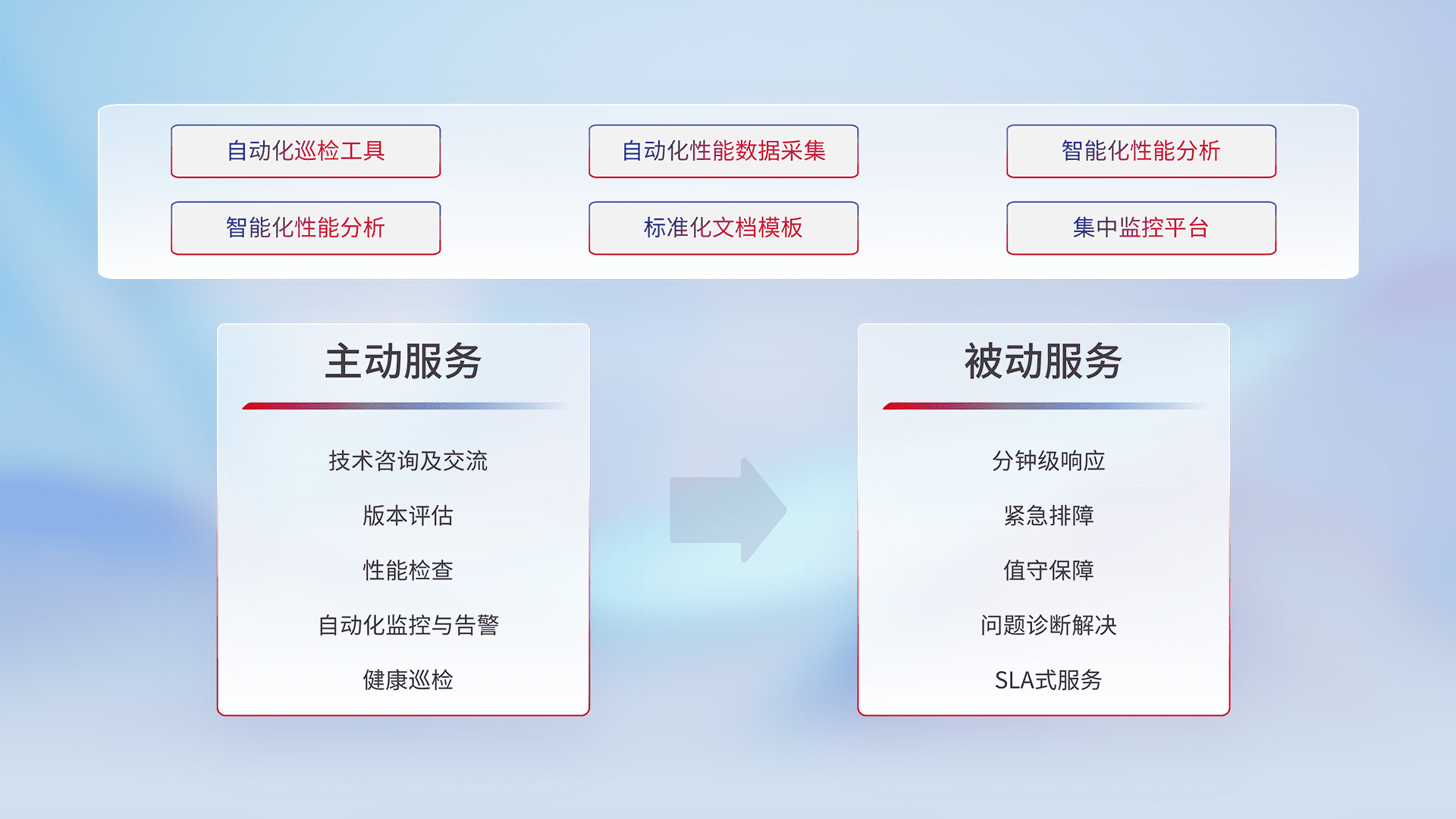 智能化工具和标准化文档,,保障服务质量,,,,提供主动服务(包含技术咨询、、版本评估、、、、性能检查、、、、自动化监控与告警、、、健康巡检)和被动服务包含(分钟级响应、、、、紧急排障、、值守保障、、、、问题诊断解决、、、、SLA服务)。。。。
